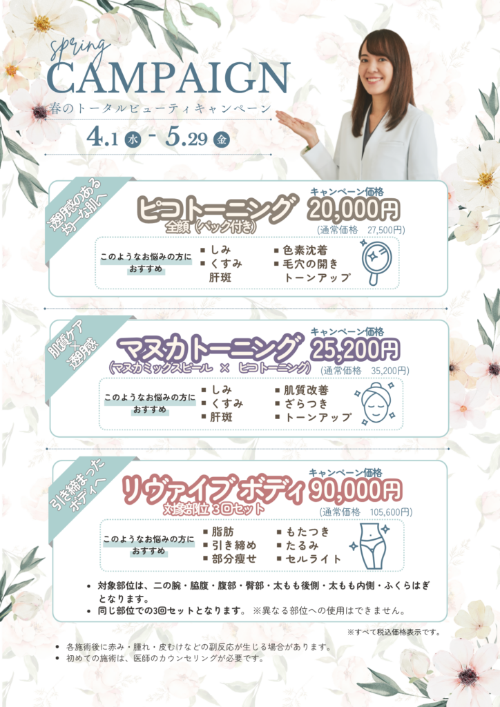 4月・5月は「春のトータルビューティキャンペーン」 2026.03.31 各施術ページにて治療内容の詳細をご確認いただけます。 ピコトーニング マヌカミックスピール リヴァイブ « 前のお知らせへ お知らせ一覧